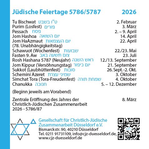 Die nebenstehende Übersicht der jüdischen Fest- und Fasttage ist als handlicher Feiertagsaufkleber (9x11 cm; Rückseite mit abziehbarer Klebefolie) bei unseren Veranstaltungen oder in der Geschäftsstelle erhältlich.